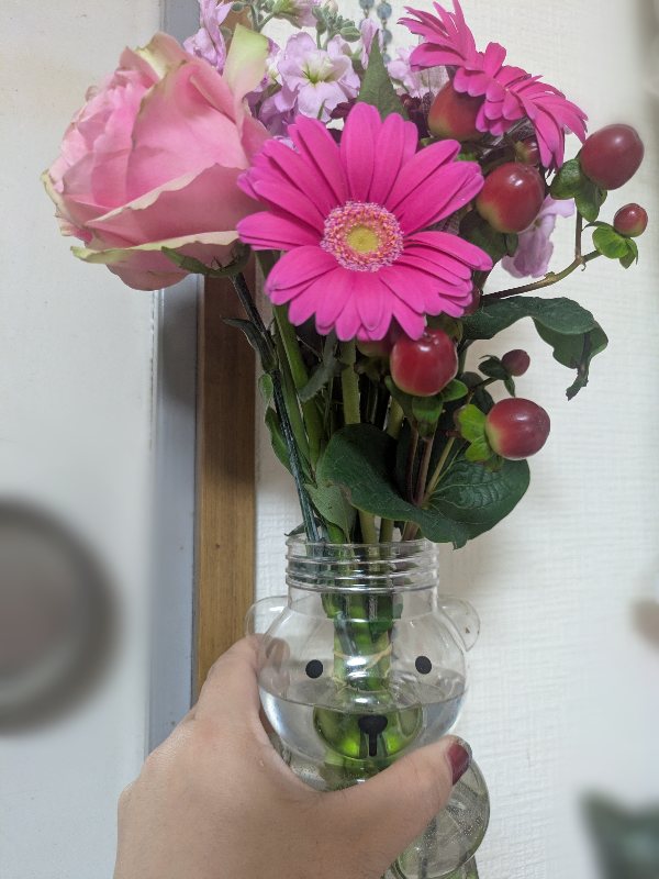 Dec 12 いただいた ピンクのブーケ 2025/12/12 14:39 こんにちは昨日いただいたピンクのブーケ花瓶らしい花瓶が我が家にないのでクマさんのウォーターボトル急遽代用我が家の殺風景な玄関が明るくなりました オキニトークで写真送れないので日記へupありがとうございますみふゆ